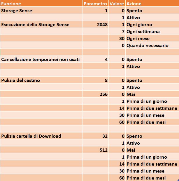 I dati di configurazione dello Storage Sense sono costituiti da sette valori nei registri dell’utente, dove la loro modifica è immediatamente applicata allo strumento di pulizia senza che sia necessario riavviare il computer o compiere altre azioni. I valori specifici sono indicati nel seguito.